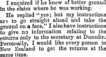 I enquired if he knew of better ground in tho claim where ho was working. He replied "yes; but my instructions avi to go straight ahead and take the ground on a face," I also have instructions to give no information relating to the returns only to the secretary at Dunedin. Personally, I would like every person in New Zealand to got the returus at the same time.