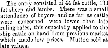 The entry consisted of 44 fat cattle, 130 fat sheep and lambs. There was a small attendance of buyers and as far as cattlo were concerned were lower than late ruling rates, this especially applied to the ship cattle on hand from previous market which made low prices. Mutton sold at late values.