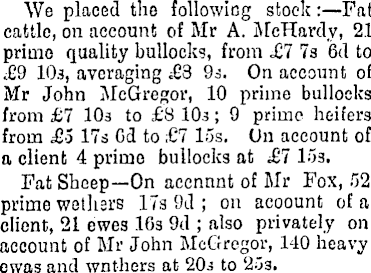 We placed the following stock : —Fat cattle, on account of Mr A. McHardy, 21 prime quality bullocks, from £7 7s 6d to £9 10s, averaging £3 9s. On account of Mr John McGregor, 10 prime bullocks from £7 103 to £8 10.3; 9 prime heifers from £0 17s Gd to £7 15s. Un account of a client 4 prime bullocks at £1 15s. Fat Sheep—On acennnt of Mr Fox, 52 prime wethers 17s 9d ; 011 acoount of a client, 21 ewes 16s 9d ; also privately on account of Mr John McGregor, 140 heavy ewas and wnthers at 20s to '2ls.