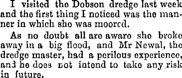 I visited the Dobson dredge last week and the first thing I noticed was the manner in which sho was moored. As no doubt all are aware she broke away in a big flood, and Mr Newal, the dredge master, had a perilous experience, and he does cot intend to take any risk in future.
