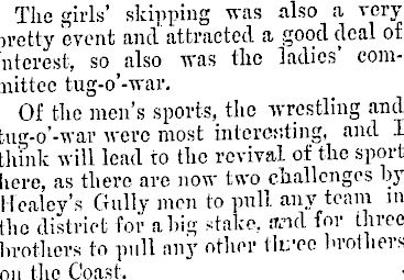 The girls' skipping was also a very pretty event and attracted a good deal of interest, so also was the ladies' committee tug-o'-war. Of the men's sports, the wrestling and tug-o'-war were most interesting, and I think will lead to the revival of the sport here, as there are now two challenges by Hcaley's Gully men to pull any team in the district for a big stake, and for three brothers to pull any other three brothers on the Coast.