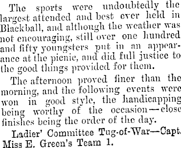 The sports were undoubtedly the largest attended and best ever held in Blackball, and although the weather was not encouraging, still over one hundred and fifty youngsters put in an appearance at the picnic, and did full justice to the good things provided for them. The afternoon proved finer than the morning, and the following events were won in good style, the handicapping being worthy of the occasion close finishes being the order of the day. Ladier' Committee Tug-of-War—Capt. Miss E. Green's Team 1.