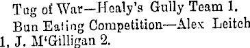 Tug of War—Healy'a Gully Team 1. Bun Eating Competition—Alex Leitch 1, J. M'Gilligan 2.