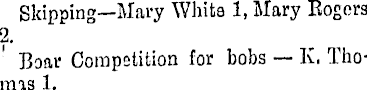 Skipping—Mary Whits 1, Mary Rogers 2. Boar Competition for bobs K, Thomis 1.