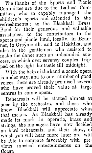 The thanks of the Sports and Picnic Committee are due to the Ladies' Committee, who so capably managed the children's sports and attended to the refreshments ; to the Blackball Brass Band for their generous and valuable assistance, to the contributors to the sports and picnic fund, locally, in Brunner, in Greymouth. and in Hokitika, and also to the gentlemen who assisted to make the dance such an unbounded success, at which over seventy couples tripped on tho light fantastic till midnight. With the help of the band a comic opera is under way, and to our number of good voices, there are already promised several who have proved their value at large centres in comic opera. Rehearsals will b 9 started almost at once by tho orchestra, and those who know Blackball will appreciate what that means. A 3 Blackball has already made its mark in operatic, brass and strings, the managers have now decided on hard rehearsals, and their show, of which you will hear more later on, will be able to compare favorably with previous musical entertainments on the Coast.