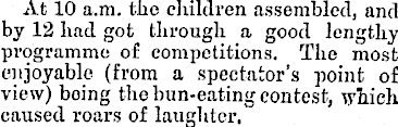 At 10 a.m. the children assembled, and by 12 had got through a good lengthy programme of competitions. The most enjoyable (from a spectator's point of view) boing the bun-eating contest, which, caused roars of laughter.