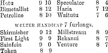 Hotu 9 10 Speculator 8 4 Bimetallist 8 12 Haria 7 12 Pctroline 8 10 Waitutu 7 6 WALTER HANDICAP 7 furlongs. Skirmisher 9 12 Millstream 8 9 First Light 9 9 Bekanui 8 7 Sainfoin 9 0 Venture 8 7 Token 8 9
