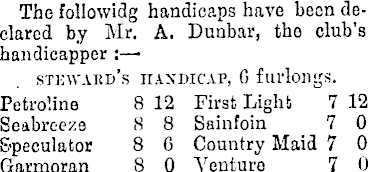 The followidg handicaps have been declared by Mr. A. Dunbar, the club's handicapper : steward's handicap, G furlongs. Petrohne 812 First Light 712 Seabreeze 8 8 Sainfoin 7 0 Speculator 8 G Country Maid 7 0 Garmoran 8 0 Venture 7 0