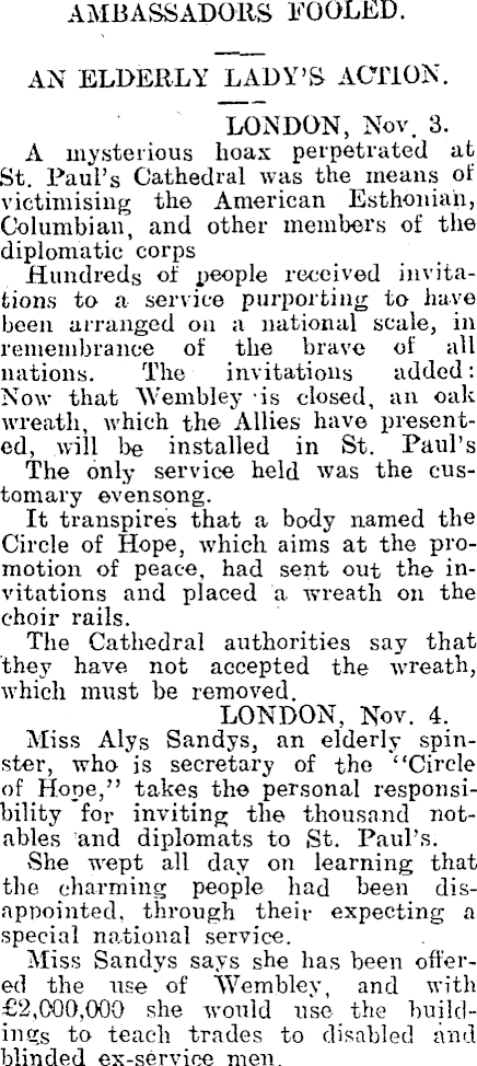 AMBASSADORS FOOLED. AN ELDERLY LADY’S ACTION. LONDON, Nov, 3. A mysterious hoax perpetrated at St. Paul’s Cathedral was the means of victimising the American Esthonian, Columbian, and other members of the diplomatic corps Hundreds of people received invitations to a service purporting to have been arranged on a national scale, in remembrance of the brave of all nations. The invitations added: Now that Wembley is closed, an oak wreath, which the Allies have presented, will be installed in St. Paul’s The only service held was the customary evensong. It transpires that a body named the Circle of Hope, which aims at the promotion of peace, had sent out the invitations and placed a wreath on the choir rails. The Cathedral authorities say that they have not accepted the wreath, which must be removed. LONDON, Nov. 4. Miss Alys Sandys, an elderly spinster, who is secretary of the “Circle of Hope,” takes the personal responsibility for inviting the thousand notables and diplomats to St. Paul’s. She wept all day on learning that the charming people had been disappointed, through their expecting a special national service. Miss Sandys says she has been offered the use of Wembley, and with £2,000,000 she -would use the buildings to teach trades to disabled and blinded ex-service men.