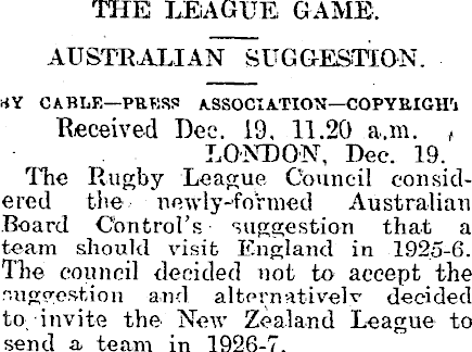THE LEAGUE GAME. AUSTRALIAN SUGGESTION. BY CABLE—PRESS ASSOCIATION—COPYRIGHT Received Dec. 19. 11.20 a.m. f LONDON, Dec. 19. The Rugby League Council considered the newly-formed Australian Board Control’s suggestion that a team should visit England in 1925-6. The council decided not to accept the suggestion and alternativelv decided to-invite the New Zealand League to send a team in 1926-7.