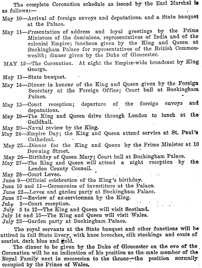 The complete Coronation schedule as issued by the Earl Marshal is as follows: — . May 10 — Arrival of foreign envoys and deputations. and a State banquet at the Palace. May 11 — Presentation of address and loyal greetings by the Prime Ministers of the dominions. representatives of India and of the colonial Empire; luncheon given by the King and Queen at Buckingham Palace for representatives of the British Commonwealth; dinner given by tlie Duke of Gloucester. MAY 12 — The Coronation. At niglit the Empire-wide broadcast by King George. May 13 — State banquet. May 14 — Dinner in honour of the King and Queen given by the Foreign Secretary at the Foreign Office; Court ball at Buckingham Palace. " May lo — Court reception; departure of the foreign envoys and deputations. May 19 — The King and Queen drivo through London to lunch at the Guildhall. May 20 — Nav,al review by the King. May 24 — Empire Day; the King and Queen attend service at St. Panl's Cathedral. May 25 — Dinner for tho King and Queen by the Prime Minister at 10 Downing Street. May 26 — Birthday of Queen Mary; Court ball at Buckingham^ Palace. May 27 — The KGig and Queen will attend a night reception by the London County Council. May 28 — Court Levee. ' . . . ..... June 9 — Official eelebration of the King's birthday. June 10 and 11 — Ceremonies of investiture at the Palace. June 22 — Levee and garden' party at Buckingham Palace. June 27 — Review of ex-servicemen by the King. July 1 — Court reception. July 5 to 12 — The King and Queen will visit Scotland. July 14 and 15 — The King and Queen will visit Wales. July 22 — Garden party at Buckingham Palace. The royal servants at the State banquet and other functibns will be attired in full State livery, with knee breech.es, silk stockings and coats of scarlet. dark blue and gold. The dinner to be given by the Duke of Gloucester on the eve of the __ Coronation will be an indication of his position as the- mai e member of the Royal Family next in succession to the throne-f-the position normally occupied by the Prince of Wales. .