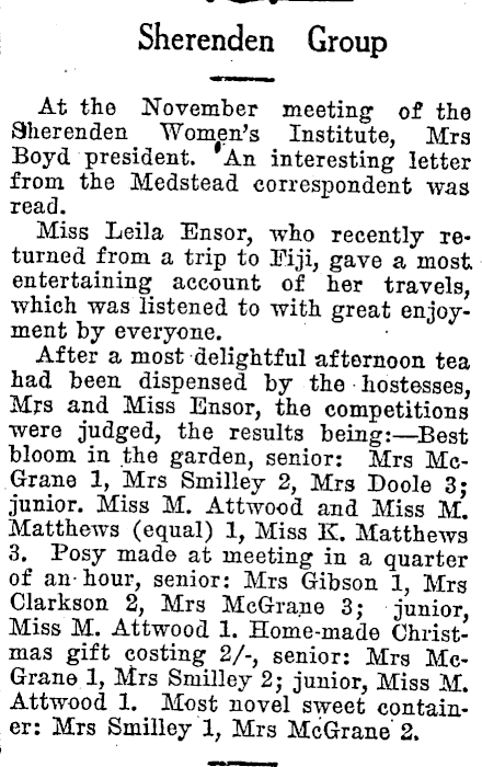 Sherenden Group At the November meeting of the Sherenden Women's Institute, Mrs Boyd president. An interesting letter from the Medstead correspondent was read. Miss Leila Ensor, who recently returned from a trip to Fiji, gave a most entertaining account of her travels, which was listened to with great enjoyment by everyone. After a most delightful afternoon tea had been dispensed by the hostesses, Mrs and Miss Ensor, the competitions were judged, the results being:— Best bloom in the garden, senior: Mrs McGrane 1, Mrs Smilley 2, Mrs Doole 3; junior. Miss M. Attwood and Miss M. Matthews (equal) 1, Miss K. Matthews 3. Posy made at meeting in a quarter of an hour, senior: Mrs Gibson 1, Mrs Clarkson 2, Mrs McGrane 3; junior, Miss M. Attwood 1. Home-made Christmas gift costing 2/-, senior: Mrs McGrane 1, Mrs Smilley 2; junior, Miss M. Attwood 1. Most novel sweet container: Mrs Smilley 1, Mrs McGrane' 2.