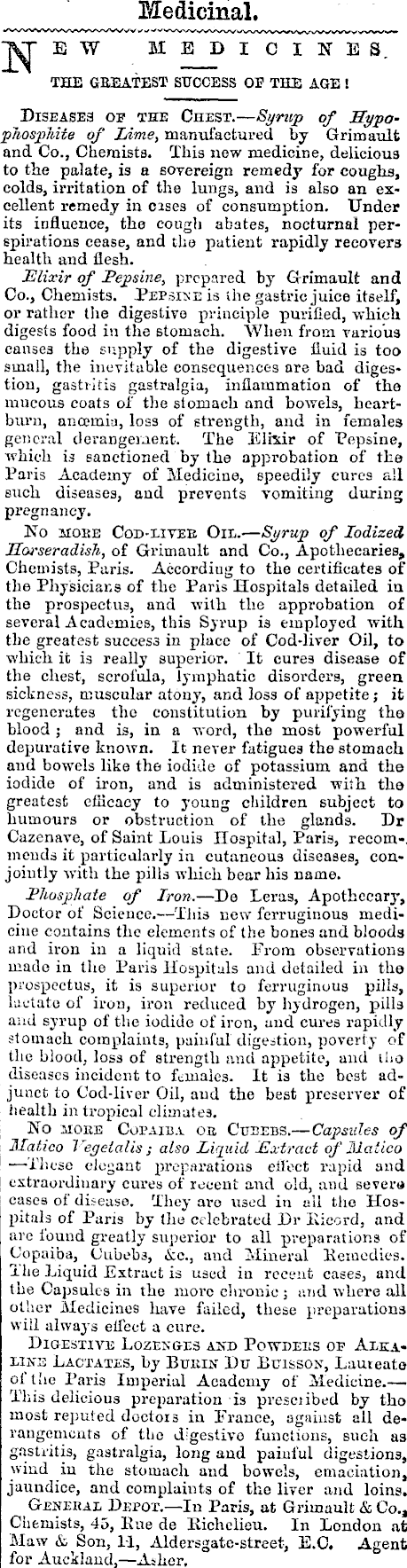 Medicinal. E W MEDICINES THE GREATEST SUCCESS OE THE AGE 1 Diseases of the Chest.— Syrup of Hypophosphite of Lime , manufactured by Grimault and Co., Chemists. This new medicine, delicious to the palate, is a sovereign remedy for coughs, colds, irritation of the lungs, and is also an excellent remedy in cases of consumption. Under its influence, the cough abates, nocturnal perspirations cease, and the patient rapidly recovers health and flesh. Elixir of Pepsine, prepared by Grimault and Co., Chemists. .Pepsine is the gastric juice itself, or rather the digestive principle purified, which 1 digests food in the stomach. When from various causes the supply of the digestive fluid is too small, the inevitable consequences are bad digestion, gastritis gastralgia, inflammation of the mucous coats of the stomach and bowels, heartburn, anocmia, loss of strength, and in females general derangement. The Elixir of Pepsine, which is sanctioned by the approbation of the Paris Academy of Medicine, speedily cures all such diseases, and prevents vomiting during pregnancy. No irosE Cod • live B Oil. —Syrup of lodized Horseradish, of Grimault and Co., Apothecaries, Chemists, Paris. According to the certificates of the Physicians of the Paris Hospitals detailed in the prospectus, and with the approbation of several Academies, this Syrup is employed with the greatest success in place of Cod-liver Oil, to which it is really superior. It cures disease of the chest, scrofula, lymphatic disorders, green sickness, muscular atony, and loss of appetite; it regenerates the constitution by purifying tha blood ; and is, in a word, the most powerful depurative known. It never fatigues the stomach and bowels like the iodide of potassium and the iodide of iron, and is administered with the greatest efficacy to young children subject to humours or obstruction of the glands. Dr Cazenave, of Saint Louis Hospital, Paris, recom-. mends it particularly in cutaneous diseases, conjointly with the pills which bear his name. Phosphate of Iron. —De Leras, Apothecary, Doctor of Science.—This new ferruginous medicine contains the elements of the bones and bloods and iron in a liquid state. From observations made in the Paris Hospitals and detailed in the prospectus, it is superior to ferruginous pills, lactate of iron, iron reduced by hydrogen, pills and syrup of the iodide of iron, and cures rapidly stomach complaints, painful digestion, poverty of the blood, loss of strength and appetite, and iho diseases incident to females. It is the best adjunct to Cod-liver Oil, and the best preserver of health in tropical climates. No MORE CuPAIBA OB CuBEBS. — Capsules Of Matico T eyetalis ; also Liquid Extract of Matico —These elegant preparations effect rapid and extraordinary cures of recent and old, and severe cases of disease. They are used in all the Hospitals of Paris by the celebrated Dr Ilieord, and are found greatly superior to all pi-eparations of Copaiba, C'ubebs, Ac., and Mineral Remedies. The Liquid Extract is used iu recent cases, and the Capsules in the more chronic; and where all other Medicines have failed, these preparations will alway r s effect a cure. Digestive Lozenges and Powders of Alkaline Lactates, by Bubin Du Buisson, Laureate of tlie Paris Imperial Academy of Medicine.— This delicious preparation is preseiibed by tho most reputed doctors in France, against all derangements of the digestive functions, such as gastritis, gastralgia, long and painful digestions, wind iu the stomach and bowels, emaciation, jaundice, and complaints of the liver and loins. General Depot.—ln Paris, at Grimault & C o. t Chemists, 45, Eire de Eichelieu. In London at Maw & Son, 1-1, Aldersgate-street, E.C. Agent for Auckland, —Asher,