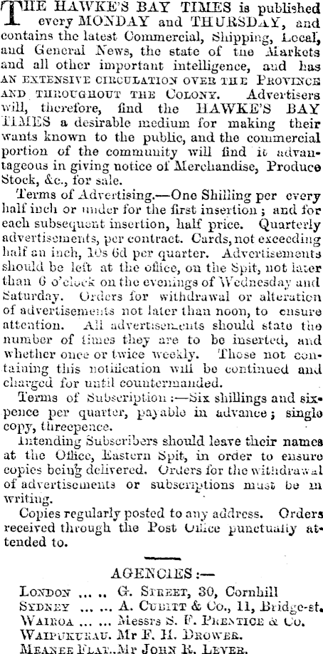 THE HAWKE’S BAY TIMES is published every MONDAY and THLIKSDnY, and contains the latest Commercial, Skipping, Cecal, and General News, the state of tue Markets and all other important intelligence, and has AN EXTENSIVE CIRCULATION OTEB THE pBOVINCR and xmiotrQTiouT the Colony. Advertisers will, therefore, find the HAWKE’S BAY TIMES a desirable medium for making their wants known to the public, and the commercial portion of the community will find it advantageous in giving notice of Merchandise, Produce Stock, &c., for sale. Terms of Advertising.—One Shilling per every half inch or under for the first insertion ; and for each subsequent insertion, half price. Quarterly advertisements, per contract. Cards, not exceeding half an inch, 10s (id per quarter. Advertisements should be left at the office, on the Spit, not later than G o’clock on the evenings of Wednesday and Saturday. Orders for withdrawal or alteration of advertisements not later than noon, to ensure attention. All advertisements should state the number of times they are to be inserted, and whether once or twice weekly. Those not containing this notification will bo continued and charged for until countermanded. Terms of Subscription :—Sis shillings and sixpence per quarter, payable in advance; single copy, threepence. intending Subscribers should leave their names at the Office, Eastern Spit, in order to ensure copies bciifig delivered. Orders for the withdrawal of advertisements or subscriptions must be in writing. Copies regularly posted to any address. Orders received through the Post Oiiice punctually attended to. AGENCIES: — London G. Street, 30, Cornhill Sydney A. Cuhiit & 00., 11, Bridgc-et. Waieoa Messrs S. F. Prentice ct Co. Waipueurau. Mr E. 11. Brower. Meaner Elat-Mp John H. Lever.