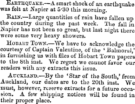 Eaethq-ctake.— A smart shock of an earthquake ■was felt at -Napier at 5-30 this morning. Bain.—Large quantities of rain have fallen up the country during the past week. The fall in ■Napier has not been so great, but last night there were some very heavy showers. Hobaut Tows. —We have to acknowledge the courtesy of Captain Valentine, of the ‘ Balmoral,’ in famishing us with files of Hobart Town papers to the Bth inst. We regret wo cannot favor our readers with any extracts this issue. Attckiand.— By the ‘Star of the South,’ from Auckland, our dates are to the 20th inst. We must, however, reserve extracts for a future occasion. A few shipping notices will be found in their proper place.
