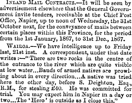 Inland Mail Contracts. —lt will bo seen by advertisement elsewhere that the General Government invite tenders, receivable at the Chief Post Office, Napier, up to noon of Wednesday, the 31st October next, for the conveyance of mails between certain places within this Province, for the period from the Ist January, 1867, to 31st Dec., 1867. Waieoa. —We have intelligence up to .Friday last, 21st inst. A correspondent, under that date writes:—“There are two rooks in the centre of the entrance to the river which are quite visible at low water... Bands of armed natives are prowling about in every direction...A native was tried here the other day, before S. Deighton, Esq., K.M., for stealing £4O. He was committed for trial. You may expect him in Napier in a day or two... The ‘Hero’ is outside as I close this.”