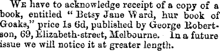 We have to acknowledge receipt of a copy of a book, entitled “ Betsy Jane Ward, hur book of Goaks,” price Is 6d, published by George Bobertson, 69, Elizabeth-street, Melbourne. In a future issue we will notice it at greater length.