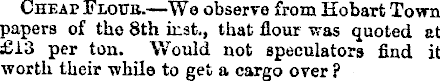 Cheap Flottb. —We observe from Hobart Town papers of the Bth hist., that flour was quoted at £l3 per ton. Would not speculators find it worth their while to get a cargo over P