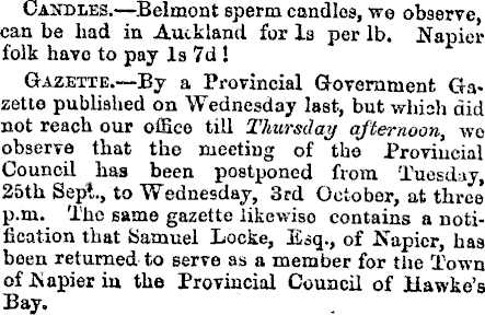 Candles. —Belmont sperm candles, we observe, can be had in Auckland for la per lb. Napier folk have to pay Is 7d ! Gazette. —By a Provincial Government Gazette published on Wednesday last, but which did not reach our office till Thursday afternoon, wo observe that the meeting of the Provincial Council has been postponed from Tuesday, 25th Sept., to Wednesday, 3rd October, at three p.m. The same gazette likewise contains a notification that Samuel Locke, Esq., of Napier, has been returned to serve as a member for the Town of Napier ia the Provincial Council of Hawke’s Bay,