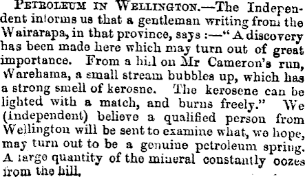 Pexboleu is. in WEllington. —The Independent intorms us that a gentleman writing from the Wairarapa, in that province, says : —“ A discovery has been made here which may turn out of great importance. From a hul on Mr Cameron’s run, vVarehama, a small stream bubbles up, which has a strong smell of kerosne. The kerosene can be lighted with a match, and burns freely.” We (independent) believe a qualified person from Wellington will be sent to examine what, wo hope, may turn out to be a genuine petroleum spring! A large quantity of the mineral constantly oozes irom the hill.
