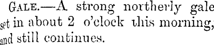 Gale. —A strong northerly gale s et in about 2 o'clock ihis morning, a nd still continues.