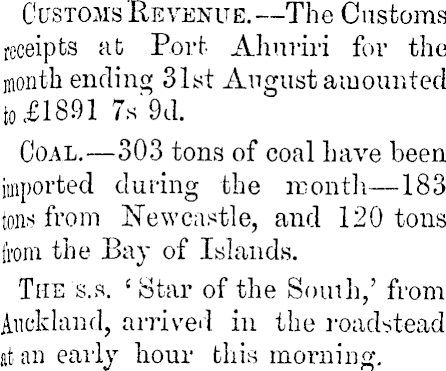 Customs Revenue. —The Customs receipts at Port Ahuriri for the month ending 31st August amounted to .£lß9l 7s"9d. Coal. —303 tons of coal have been imported during the month—lß3 tons from Newcastle, and 120 tons from the Bay of Islands. The s.s. 'Star of the South,' from Auckland, arrive'! in the roadstead at an early hour this morning.