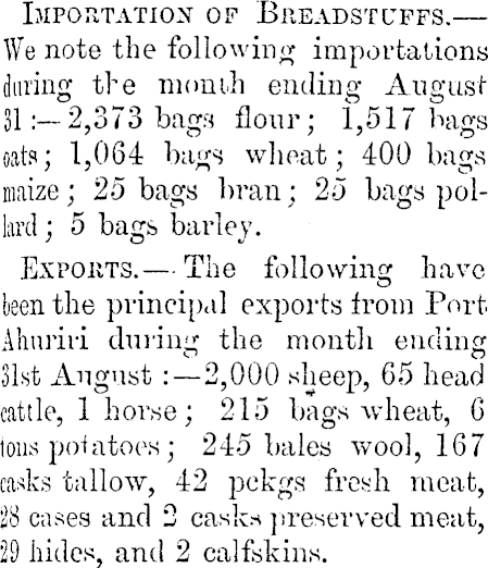 Importation of Breadstcffs.— We note the following importations daring the month ending August 31:—2,373 bags flour; 1,517 bags oats; 1,064 bags wheat; 400 bags maize; 25 bags bran; 25 bags pollard; 5 bags barley. Exports.— The following have ken the principal exports from Port Ahuriri during the month ending 31st August :—2,000 sheep, 65 head cattle, 1 horse; 215 bags wheat, 6 tons potatoes; 245 bales woo], 167 casks tallow, 42 pekgs fresh meat, 28 cases and 2 cask* preserved meat, 29 hides, and 2 calfskins.