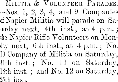 Militia & Volunteer Parades. —Nos. 1,2, 3,4, and 9 Companies of Napier Militia will parade on Saturday next, 4th inst., at, 4 p.m. ; the Napier Rifle Volunteers on Monday next, 6ch inst., at 4 p.m. ; No. 10 Company of Militia on Saturday, 11th inst. ; No. 11 on Saturday, 18th inst. ; and No. 12 on Saturday, 25 th inst.