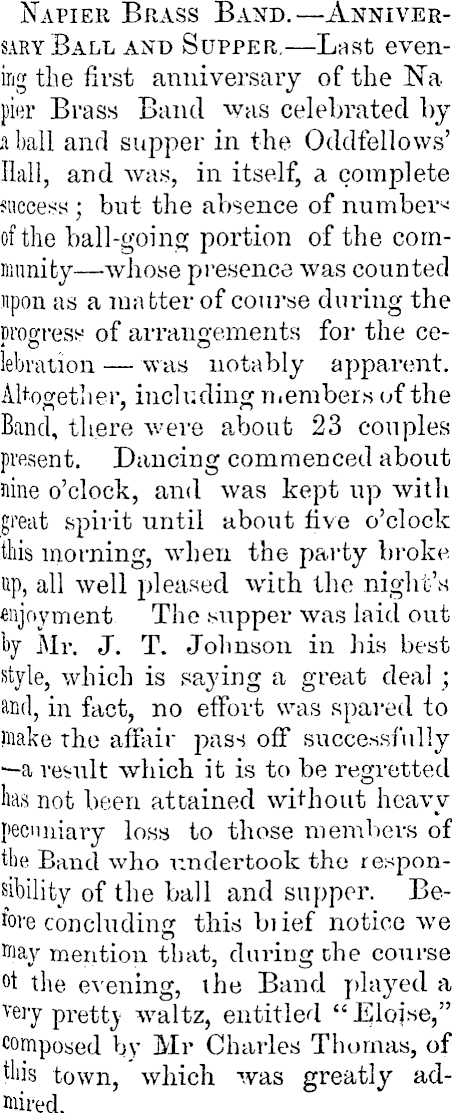 Napier Brass Band.—Anniversary Ball and Supper.—Last evening the first anniversary of the Na pier Brass Band was celebrated by a ball and supper in the Oddfellows' Hall, and was, in itself, a complete success ; but the absence of number* of the ball-going portion of the community—whose presence was counted upon as a matter of course during the Progress of arrangements for the celebration was notably apparent. Al+ogether, including members of the Band, there were about 23 couples present. Dancing commenced about nine o'clock, and was kept up with great spirit until about five o'clock this morning, when the party broke up, all well pleased with the night's! -enjoyment The .supper was laid out; by Mr. J. T. Johnson in his best style, which is saying a great deal ; and, in fact, no effort was spared to Wake the affair pass off successfully —a result which it is to be regretted has not been attained without heavy pecuniary loss to those members of the Band who undertook the responsibility of the ball and supper. Before concluding this biief notice we fray mention that, during the course °t the evening, the Band played a very pretty waltz, entitled "Eloise," composed by Mr Charles Thomas, of this town, which was greatly admired.