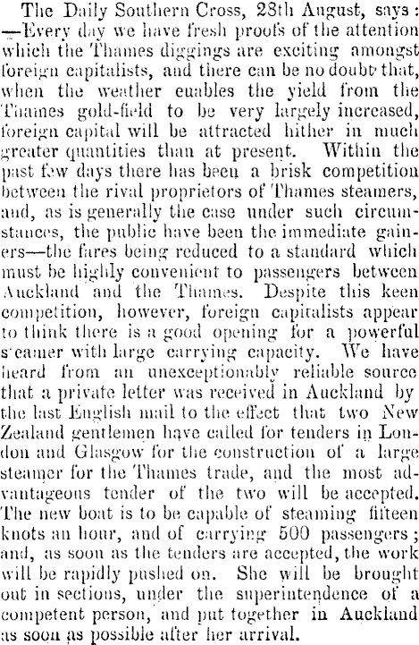 The Daily Southern Cross, 28th August, says : —Every day we have fresh proofs of the attention which the Thames diggings are exciting amongst foreign capitalists, and there can be no doubt'that, when the weather enables the yield from the Thames gold-field to be very largely increased, foreign capital will be attracted hither in much greater quantities than at present. Within the past few days there has been a brisk competition between the rival proprietors of Thames steamers, and, as is generally the case under such circumstances, the public have been the immediate gainers—the fares being reduced to a standard which must he highly convenient to passengers between Auckland and the Thames. Despite this keen competition, however, foreign capitalists appear to think there is a good opening for a powerful s eamer with large carrying capacity. We have heard from an unexceptionably reliable source that a private letter was received in Auckland by the last English mail to the effect that tsvo New Zealand gentlemen have catted for tenders in London and Glasgow for the construction of a large steamer for the Thames trade, and the most advantageous tender of the two will be accepted. The new boat is to be capable of steaming fifteen knots an hour, and of carrying 500 passengers ; and, as soon ns the tenders are accepted, the work will be rapidly pushed on. She will be brought out in sections, under the superintendence of a competent person, and put together in Auckland as soon as possible after her arrival.