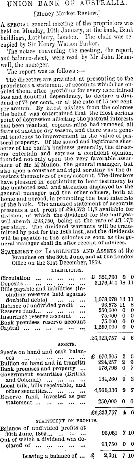 UNION BANK OP AUSTRALIA. [Money Market Review.] A SPECIAL general meeting of the proprietors was held ou Monday, 10th January, at the bank, Bank buildings, Lothbury, London. The chair was occupied by Sir Henry Watson Parker. The notice convening the meeting, the report, and balance-sheet, were read by Mr John Brainwell, the manager. The report was as follows : '■ The directors are gratified at presenting to the proprietors a statement of accounts which has enabled them, after providing for every ascertained loss and doubtful dependency, to declare a dividend of 7* per cent., or at the rate of 15 per cent, per annum. By latest advices from the colonies the belief was entertained that the most serious point of depression affecting the pastoral interests had been reached, copious rains had removed all fears of another dry season, and there was a general tendency to improvement in the value of pastoral property. Of the sound and legitimate character of the bank's business generally, the directors entertain and express a confident opinion, founded not only upon the very favorable assurance of Mr M'Mulleu, the general manager, but also upon a constant and rigid scrutiny by the directors themselves of every account. The directors have pleasure in continuing to bear testimony to the unabated zeal and attention displayed by the general manager and the other officers, both at home and abroad, in promoting the best interests of the bank. The annexed statement of accounts presents a net profit of £9(1,573 11/8 available for division, of which the dividend for the half-year will absorb £93,750, being at the rate of £1 17/6 per share. The dividend warrants will be transmitted by post for the 18th inst., and the dividends will be payable in the colonies as soon as the general manager shall lis after receipt of advices. Statement of Liabilities and Assets at the Branches on the 30th June, and at the London Office on the 31st December, 1869.. LIABILITIES. Circulation £ 321,790 0 0 Deposits ... ... 3,176,414 18 11 Bills payable and liabilities (including reserves held against doubtful debts) 1,078,978 13 11 Balance of undivided profit ... 96,573 11 8 Reserve fund 250,000 0 0 Insurance reserve account ... 75.000 0 0 Bank premises reserve account 75,0i)0 0 0 Capital ... ~ 1,250,000 0 0 £6,323,757 4 6 ASSETB. Specie on hand and cash balances .'. £ 970,305 2 5 Bullion on hand and in transitu 224,257 2 9 Bank premises and property ... 178,798 0 7 Government securities (British and Colonial) 131,260 9 2 Local bills, bills receivable, and other securities..'. 4,566,136 9 7 Reserve fund, invested as per statement ... ... 250,000 0 0 £6,323,757 4 6 STATEMENT OV PROFITS. Balance of undivided profits at '3oth June, 1869 : 96,05,1 7 10 Out of which a dividend was declared of ... 93,750 0 0 Leaviug a balance of ... £ 2,301 7 10
