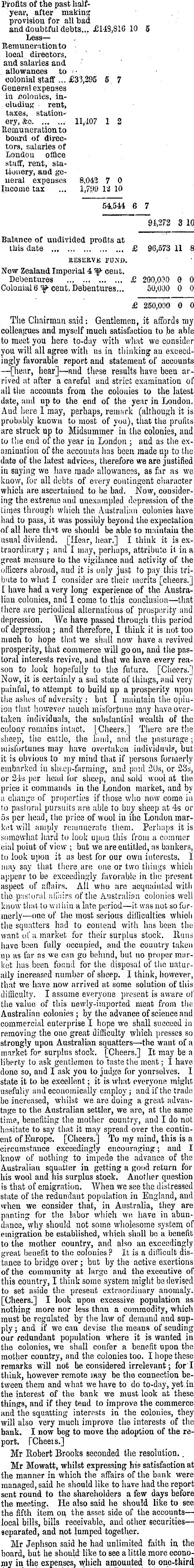 Profits of the past halfyear, after making provision for all Dad and doubtful debts... £149,816 10 5 LessRemuneration to local directors, and salaries and allowances to - colonial staff ...£33,293 5 7 General expenses in polonies, including rent, taxes, stationery, &c 11,107 1 2 Remuneration to board of directors, salaries of London office staff, rent, stationery, and general expenses 8,042 7 0 Income tax ... 1,7.99 12 10 54.544 6 7 94,272 3 10 Balance of undivided profits at this date £ 96,573 11 8 RESERVE I'DND. New Zealand Imperial 4 f- cent. Debentures £ 200,000 0 0 Colonial 6 f cent. Debentures... 50,000 0 0 £ 250,000 0 0 The Chairman said: Gentlemen, it affords my colleagues and myself much satisfaction to be able to meet you here to-day with what we consider you will all agree with us in thinking an exceedingly favorable report and statement of accounts —[hear, hear] —and these results have been arrived at after a careful and strict examination of all the accounts from the colonies to the latest date, and up to the end of the year in London. And here 1 may, perhaps, remark (although it is probably known to most of you), that the profits are struck up to Midsummer in the colonies, and to the end of the year in London ; and as the examination of the accounts has been made up to the date of the latest advicus, therefore we are justified in saying we have made allowances, as far as we know, for all debts of every contingent character which are ascertained to be bad. Now, considering the extreme and unexampled depression of the dines through which the Australian colonies havehad to pass, it was possibly beyond the expectation of all here tint we should be able to maintain the usual dividend. [Hear, hear.] I think it is extraordinary ; and I may, perhaps, attribute it in a great measure to the vigilance and activity of the officers abroad, and it is only just to pay this tribute to what I consider are their merits [cheers.] I have had a very long experience of the Australian colonies, and I come to this conclusion—that there are periodical alternations of prosperity and depression. We have passed through this period of depression ; and therefore, I think it is not too much to hope that we shall now have a revived prosperity, that commerce will goon, and the pastoral interests revive, and that we have every reason to look hopefully to the future. [Cheers.] Now, it is certainly a sad state of things, and very painful, to attempt to build up a prosperity upon the ashes of adversity : but I maintain the opinion that however much misfortune may have overtaken individuals, the substantial wealth of the colony remains intact. [Cheers.] There are the sheep, the cattle, the land, and the pasturage ; misfortunes may have overtaken individuals, but it is obvious to my mind that if persons formerly embarked in she.ep-farming, and paid 30s, or 235, or 2-i'S per head for sheep, and sold wool at the price it commands in the London market, and by a change of properties if those who now come in to pastoral pursuits are able to buy sheep at 4s or 5s per head, the price of wool in ihe London market will amply remunerate them. Perhaps it is somewhat hard to look upon this from a commer jcial point of view ; but we are entitled, as bankers, to look upon it as best for our own interests. I may say that there are one or two things which appear to be exceedingly favorable in the present aspect of affairs. All who are acquainted with the pastoral aii'airs of the Australian colonies well know that to within a late period—it was not so formerly —one of the most serious difficulties which the squatters had to contend with has been the want of a market for their surplus stock. Runs have been fully occupied, and the country taken up as far as »'e can go behind, but no proper market lias been found for the disposal of the naturally increased number of sheep. I think, however, that we have now arrived at some solution of this difficulty. I assume everyone present is aware of the value of this newly-imported meat from the Australian colonies ; by the advance of science and commercial enterprise I hope we shall succeed in removing the one great difficulty which presses so strongly upon Australian squatters—the want of a market for surplus stock. [Cheers.] It may be a liberty to ask gentlemen to taste the meat; I have done so, and I ask you to judge for yourselves. I state it to be excellent; it is what everyone might usefuliy and economically employ; and if the trade be increased, whilst we are doing a great advantage to the Australian settler, we are, at the same time, benefiting the mother country, and I do not hesitate to say that it may spread over the continent of Europe. [Cheers.] To my mind, this is a circumstance exceedingly encouraging; and I know of nothing to impede the advance of the Australian squatter in getting a good return for his wool and his surplus stock. Another question is that of emigration. When we see the distressed state of the redundant population in England, and when we consider that, in Australia, they are panting for the labor which we have in abundance, why should not some wholesome system of emigration be established, which shall be a benefit to the mother country, and also an exceedingly great benefit to the colonies ? It is a difficult distance to bridge over ; but by the active exertions of the community at large and the executive of this country, I think some system might be devised to set aside the present extraordinary anomaly. [Cheers.] I look upon excessive population as nothing more nor less than a commodity, which must be regulated by the law of demand and supply ; and if we can devise the means of sending our redundant population where it is wanted in the colonies, we shall confer a benefit upon the mother country, and the colonies too. I hope these remarks will not be considered irrelevant; fori think, however remote may be the connection between them and wha