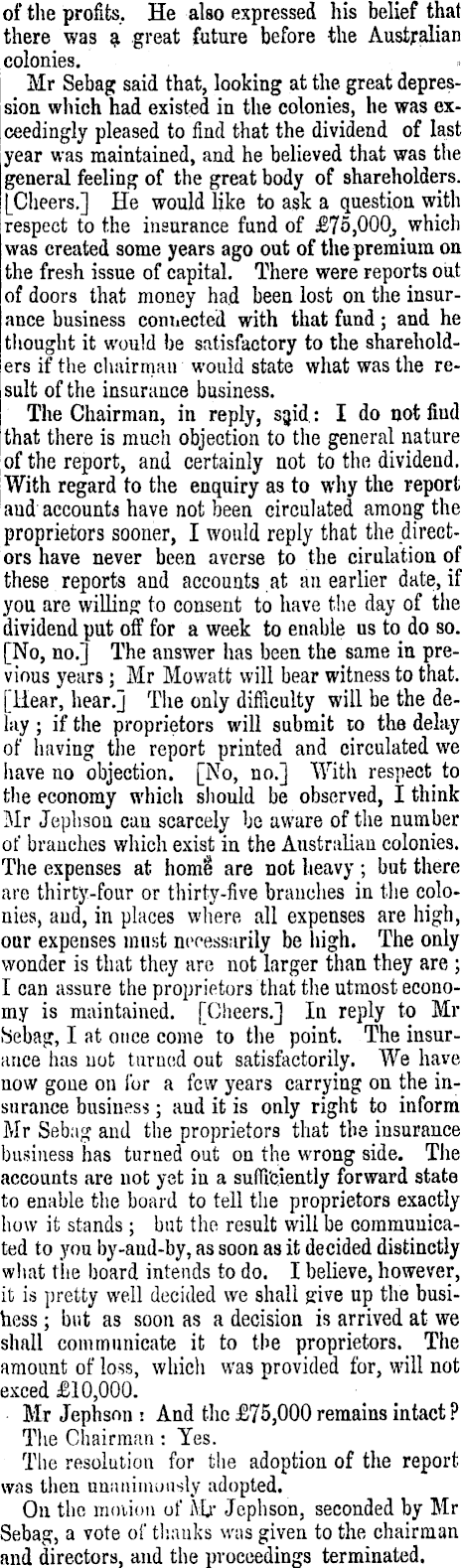 of the profits. He also expressed his belief that! there was a great future before the Australian colonies. Mr Sebag said that, looking at the great depression which had existed in the colonies, he was exceedingly pleased to find that the dividend of last year was maintained, and he believed that was the general feeling of the great body of shareholders. [Cheers.] He would like to ask a question with respect to the insurance fund of £75,000, which was created some years ago out of the premium on the fresh issue of capital. There were reports out of doors that money had been lost on the insurance business connected with that fund; and he thought it would be satisfactory to the shareholders if the chairman would state what was the result of the insurance business. The Chairman, in reply, said.: I do not find that there is much objection to the general nature of the report, and certainly not to the dividend. With regard to the enquiry as to why the report and accounts have not been circulated among the proprietors sooner, I would reply that the directors have never been averse to the cirulation of these reports and accounts at an earlier date, if you are willing to consent to have the day of the dividend put off for a week to enable us to do so. [No, no.] The answer has been the same in previous years; Mr Mowatt will bear witness to that. [Hear, hear.] The only difficulty will be the delay ; if the proprietors will submit to the delay of having the report printed and circulated we have no objection. [No, no.] With respect to the economy which should be observed, I think Mr Jephson can scarcely be aware of the number of branches which exist in the Australian colonies. The expenses at home 1 are not heavy ; but there are thirty-four or thirty-five brandies in the colonies, and, in places where all expenses are high, our expenses must necessarily be high. The only wonder is that they are not larger than they are ; I can assure the proprietors that the utmost economy is maintained. [Cheers.] In reply to Mr Bebag, lat once come to the point. The insurance has not turned out satisfactorily. We have now gone on for a few years carrying on the insurance business; and it is only right to inform Mr Sebag and the proprietors that the insurance business has turned out on the wrong side. The accounts are not yet in a sufficiently forward state to enable the board to tell the proprietors exactly how it stands ; but the result will be communicated to you by-and-by, as soon as it decided distinctly what the board intends to do. I believe, however, it is pretty well decided we shall give up the business ; but as soon as a decision is arrived at we shall communicate it to the proprietors. The amount of loss, which was provided for, will not exced £IO,OOO. Mr Jephson i And the £75,000 remains intact ? The Chairman: Yes. The resolution for the adoption of the report was then unanimously adopted. On the motion of Ms Jephson, seconded by Mr Sebag, a vote of thanks was given to the chairman and directors, and the proceedings terminated.