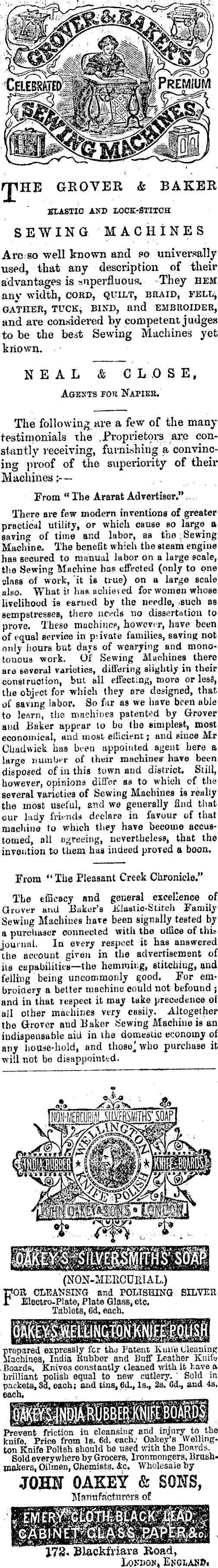 IKf^ Celebrated PREMIUM JHE GROVER & BAKER ELASTIC AND LOCK-STITCH SEWING MACHINES Arc;so well known and so universally used, that any description of their advantages is superfluous. They hem any width, cord, quilt, braid, fell, GATHER, TUCK, BIND, and EMBROIDER, and are considered by competent judges to be the best Sewing Machines yet known. NEAL C L.O S E, Ag-exts for Napikb. The following are a few of the many testimonials the .Proprietors arc constantly receiving, furnishing a convincing proof of the superiority of their Machines;— From " The Ararat Advertiser." There are few modern inventions of greater practical utility, or which cause so large a saving of time and labor, as the;Sewing Machine. The benefit which the steam engine has secured to manual labor on a large scale, the Sewing Machine has effected (only to one dass of work, it is true) on a large scale also. What it has, achieved for women whose livelihood is earned by the needle, /Such as sempstresses, there needs no dissertation to prove. Tbeso machines, however, have been of equal service in private families, saving not only hours but days of wearying and monotonous work. Of Sewing Machines there are several varieties, differing slightly in their construction, but all effecting, more or less, the object for which they are designed, that of saving iabor. So far as we have been able to learn, the machines patented by Grover and Baker appear to bo the simplest, most economical, and most ellicient; and since Mr Chadwick has been appointed agent here a large number of their machines' have been disposed of in this town and district. Still, however, opinions differ as to which of the several varieties of Sewing Machines is really the most useful, and we generally find that our lady friends declare in favour of that machine to which they have become accustomed, all agreeing, nevertheless, that the invention to them has indeed proved a boon. From "The Pleasant Creek Chronicle." The efficacy and general excellence of Grover and Baker's Elastie-Stitch Family Sewing Machines have been signally tested by a purchaser connected with the office of this journal. In every respect it has answered the account given in the advertisement of its capabilities—the hemming, stitchiug, and felling being uncommonly good. For embroidery a better machine could not befound j and in that respect it may take precedence of all other machines very easily. Altogether the Grover and Baker Sewing Machine is an indispensable aid in the domestic economy of any house-hold, and who purchase it will not be disappointed. mmMimmmm (NON-MERCUPJAL.) CB, CLEANSING and POLISHING* SILVER Electro-Plate, Plate Glass, etc. Tablets, 6d, each. prepared expressly fcr tha Patent Knife Cleaning Slachines, India Rubber and Buff Leather Kuifo Boards, Knive3 constantly cleaned with it have a brilliant polish equal to new cutlery. ' Sold in packets,Bd. each; and tins,6d., Is., 2s. Gd., and 4s. each. Prevent friction in cleansing and injury to the knife. Price from Is. 6d. each: Oakey's Wellington Knife Polish should be used with the Boards. Sold everywhere by Grocers, Ironmongers, Brush, makers, Oilmen, Chemists. &c. Wholesale by JOHN OAKEY & SONS, Manufacturers of J 73« Biackfriars Road, LOKDON, Eji'G&AN&e