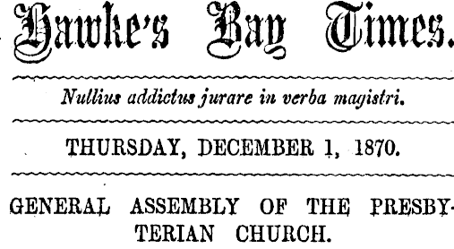 Hawke's Bay Times. Nullius addictus jurare in verba magistri. THURSDAY, DECEMBER 1, 1870. GENERAL ASSEMBLY OF THE PRESBYTERIAN CHURCH.