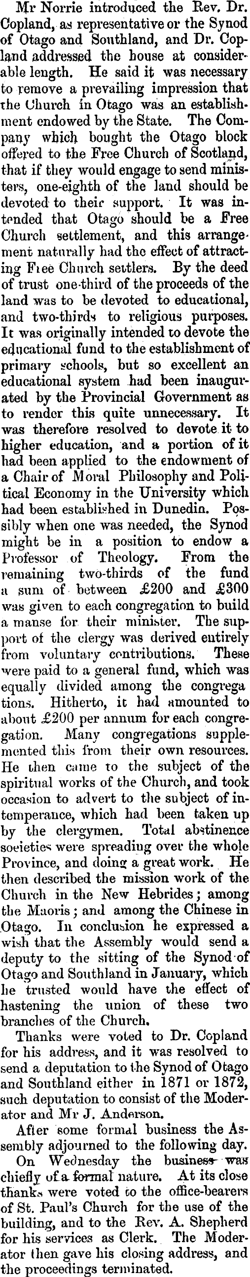 Mr Norrie introduced the Rev, Dr. Copland, as representative or the Synod of Otago and Southland, and Dr. Copland addressed the house at considerable length. He said it was necessary to remove a prevailing impression that the Uhurch in Otago was an establishment endowed by the State. The Company which bought the Otago block offered to the Free Church of Scotland, that if they would engage to send ministersj one-eighth of the land should be devoted to their support. It was intended that Otago should be a Free Church settlement, and this arrangement naturally had the effect of attracting Fiee Church settlers. By the deed of trust one-third of the proceeds of the land was to be devoted to educational, and two-thirds to religious purposes. It was originally intended to devote the educational fund to the establishment of primary schools, but so excellent an educational system had been inaugurated by the Provincial Government as to render this quite unnecessary. It was therefore resolved to devote it to higher education, and a portion of it had been applied to the endowment of a Chair of Moral Philosophy and Political Economy in the University which had been established in Dunedin. Possibly when one was needed, the Synod might be in a position to endow a Professor of Theology. From the remaining twO-thirds of the fund a sum of between £2OO and .£3OO was given to each congregation to build a manse for their minister. The support of the clergy was derived entirely from voluntary contributions. These were paid to a general fund, which was equally divided among the congrega tions. Hitherto, it had amounted to about £2OO per annum for each congregation. Many congregations supplemented this from their own resources. He then c.ime to the subject of the spiritual works of the Church, and took occasion to advert to the subject of intemperance, which had been taken up by the clergymen. Total abstinence soeietie* were spreading over the whole Province, and doing a great work. He then described the mission work of the Church in the New Hebrides; among the Maoris; and among the Chinese in Otago. In conclusion he expressed a wish that the Assembly would send a deputy to the sitting of the Synod of Otago and Southland in January, which he trusted would have the effect of hastening the union of these two branches of the Church. Thanks were voted to Dr. Copland for his address, and it was resolved to send a deputation to the Synod of Otago and Southland either in 1871 or 1872, such deputation to consist of the Moderator and Mr J. Anderson. After some formal business the Assembly adjourned to the following day. On Wednesday the business- was chiefly of a- formal nature. At its close thank* were voted to the office-bearers of St. Paul's Church for the use of the building, and to the Rev. A. Shepherd for his services as Clerk. The Moderator then gave his closing address, and the proceedings terminated.