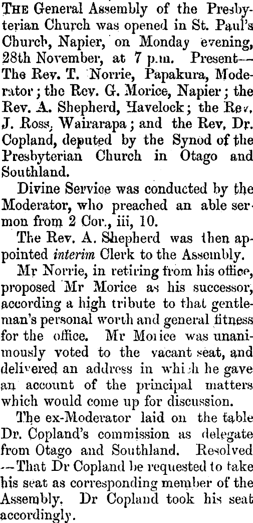 The General Assembly of the Presbyterian Church was opened in St. Paul’s Church, Napier, on Monday evening, 28th November, at 7 p.m. Present— The Rev. T. Nome, Papakura, Moderator ; the Rev. G. Morice, Napier; the Rev. A. Shepherd, Havelock; the Re/, J. Ross. Wairarapa; and the Rev, Dr. Copland, deputed by the Synod of the Presbyterian Church in Otago and Southland. Divine Service was conducted by the Moderator, who preached an able sermon from 2 Cor., iii, 10. The Rev. A. Shepherd was then appointed interim Clerk to the Assembly. Mr Norrie, in retiring from his office, proposed Mr Morice as his successor, according a high tribute to that gentleman’s personal worth and general litness for the office. Mr Moi ice was unanimously voted to the vacant seat, and delivered an address in whidi he gave an account of the principal matters which would come up for discussion. The ex-Moderator laid on the table Dr. Copland’s commission as delegate from Otago and Southland. Resolved —That Dr Copland be requested to take his scat as corresponding member of the Assembly. Dr Copland took his seat accordingly.
