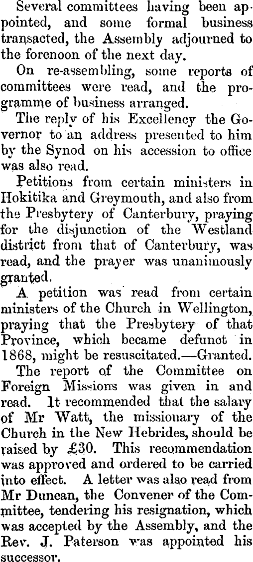 Several committees having been appointed, and some formal business transacted, the Assembly adjourned to the forenoon of the next day. On re-assembling, some reports of committees were read, and the programme of business arranged. The reply of his Excellency the Governor to an address presented to him by the Synod on his accession to office was also read. Petitions from certain ministers in Hokitika and Greymouth, and also from the Presbytery of Canterbury, praying for the disjunction of the Westland district from that of Canterbury, was read, and the prayer was unanimously granted. A petition was read from certain ministers of the Church in Wellington, praying that the Presbytery of that Province, which became defunot in 1868, might be resuscitated.—Granted. The report of the Committee on Foreign Missions was given in and read. It recommended that the salary of Mr Watt, the missionary of the Church in the New Hebrides, should be raised by <£3o. This recommendation was appi*oved and ordered to be carried into effect. A letter was also read from Mr Duncan, the Convener of the Committee, tendering his resignation, which was accepted by the Assembly, and the Rev. J[. Paterson was appointed his successor.