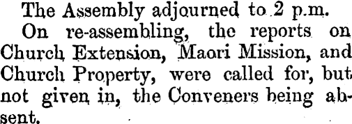 The Assembly adjourned to 2 p.m. On re-assembling, the reports on Church, Extension, Maori Mission, and Church Property, were called for, but. not given, in, the Conveners being absent.