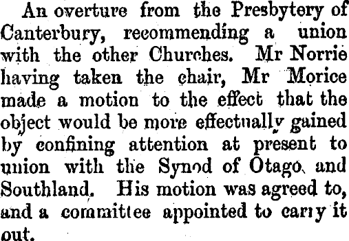An overture from the Presbytery of Canterbury, recommending a union with the other Churches. Mr Norrie having taken the chair, Mr Morice made a motion to the effect that the object would be more effectually gained by confining attention at present to union with the Synod of OtagOs and Southland. His motion was agreed to, and a committee appointed to cany it out.