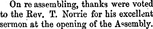 On re assembling, thanks were voted to the Rev. T. Norrie for his excellent sermon at the opening of the Assembly.