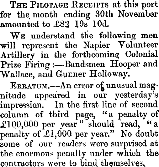 The Pilotage .Receipts at this port for the month ending 30fch November amounted to £B2 19s 10d. We understand the following men will represent the Napier Volunteer Artillery in the forthcoming Colonial Prize Firing :—Bandsmen Hooper and Wallace, and Gunner Hollo way. Erratum.—An error oj unusual magnitude appeared in our yesterday's impression. In the first line of second column of third page, " a penalty of Jgloo,ooo per year" should read, "a penalty of £I,OOO per year." No doubt some of our readers were surprised at the enormous penalty under which the Qontractoirs were to bind themselves