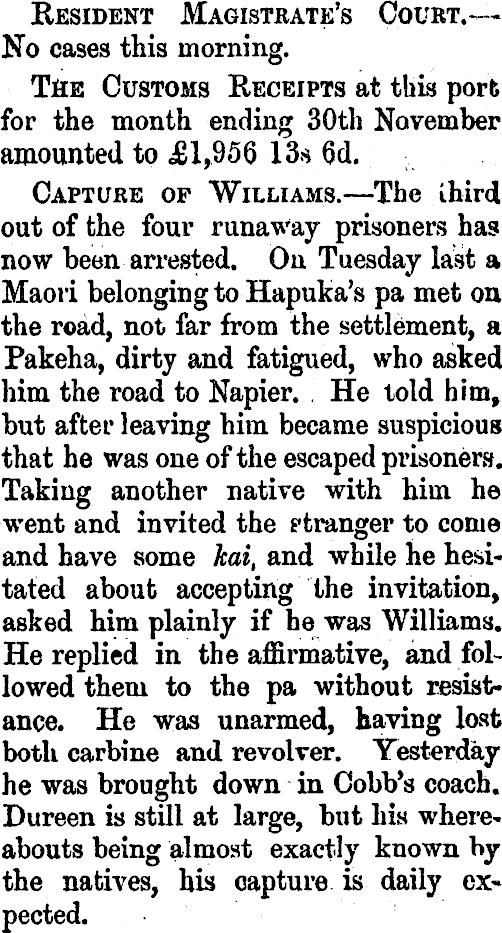 Resident Magistrate's Court.— No cases this morning. The Customs Receipts at this porfc for the month ending 30th November amounted to £1,956 13s Gd. Capture op Williams.—The third out of the four runaway prisoners has now been arrested. On Tuesday last a Maori belonging to Hapuka's pa met on the road, not far from the settlement, a Pakeha, dirty and fatigued, who asked him the road to Napier. He told him, but after leaving him became suspicious that he was one of the escaped prisoners. Taking another native with him he went and invited the stranger to come and have some kai, and while he hesitated about accepting the invitation, asked him plainly if he was Williams. He replied in the affirmative, and followed them to the pa without resistance. He was unarmed, having lost both carbine and revolver. Yesterday he was brought down in Cobb's coach. Dureen is still at large, but his whereabouts being almost exactly known by the natives, his capture is daily ex* pected.