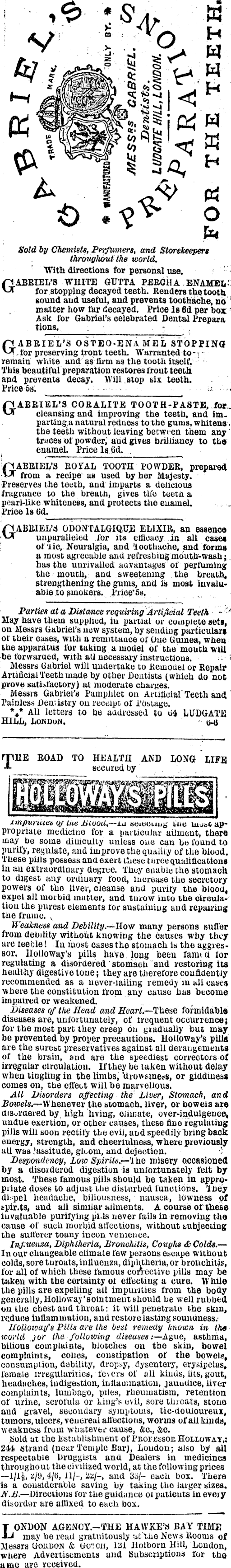 ,e> g.l'LV—>.. i i n»l raffiqßl > w I all - fitoW 6y Chemists, Perfwners, and Storekeepers throughout the world. With directions for personal use. GABRIEL'S WHITE GUTTA PEBOHA ENAMEL-' for stopping decayed teeth. Benders the. tooth sound and useful, and prevents toothache, no ' matter how far decayed. Price is 8d per box • Ask for Gabriel's celebrated Dental Prepara tions. ABBIEL'S OSTEO-ENAMEL STOPPING v*,for preserving front teeth. Warranted to-; remain white and as firm as the tooth itself. This beautiful preparation restores front teeth and prevents decay. Will stop six teeth. Price ss. cleansing and improving the teeth, and imparting a natural redness to the gums, whitens > the teeth without leaving between them any traces of powder, and gives brilliancy to the enamel. Price Is 6d. from a recipe as used by her Majesty. Preserves the teeth, and imparts a delicious fragrance to the breath, gives the teetn a pearl-like whiteness, and protects the enamel. Price Is (Jd. GABRIEL'S ODON TALGIQVE ELIXIR, an essence unparalleled for its efficacy in all casea of lie, Neuralgia, and 'ioothache, and forma a most agreeable and refreshing mouth-wash; has the unrivalled auvantages of perfuming the mouth, and sweetening the breath, strengthening the gums, and is most invaluable to smokers. Price" ss. Parties at a Distance requiring Artificial Teeth - "■* May have them supplied, in partial or complete sets, on Messrs Gabriel's new system, by sending particular* of their cases, with a retmttaace of One Guinea, when the apparatus for taking a model of the mouth will be forwarded, with all necessary instructions. AIAUSrt! iln\w\c*\ will mulDl'tsl/u tn Dn.>,.-.,,.A „„ T)i».l. Artificial Teeth made by other Dentists (which do not prove satisfactory) at moderate charges. Messrs Gabriel's Pamphlet on Artificial' Teeth and Painless Den; istry on receipt, of Postage. *»* All letters to be addressed to tl4 LUDGATE HILL, Lokdow. o-tt THE BOAD TO HEALTH AND LONG LIFE secured by mmffimm : :hv*V; impunities oj Ut,e ±>cuoU, — in seieouuy t'ue iujoc appropriate medicine for a particular ailment, there may be some difficulty unless one can be found to purify, regulate, and improve the quality of the blood. These pills possess and exert these tureequalifications in an extraordinary degree. They enable the stomach to digest any ordinary food, increase the secretory powers of the liver, cleanse and purify the blood, expel all morbid matter, and throw into the circulation the purest elements lor sustaining and repau-ing the frame. v Weakness and Debility.— How many persons suffer from debility without knowing the causes why they are feeble! In iuost cases the stomach is the aggressor. Holloway's pills have long been faim d tor regulating a disordered stomach and restoring its healthy digestive tone; they are therefore confidently recommended as a uever-iailing remedy in all cases where the constitution from any cause has become impaired or weakened. Diseases of the Read and EearL— These formidable diseases are, unfortunately, of irequent occurrence; for the most part they creep on gradually but may be prevented by proper precautions. Holloway's pills are the surest preservatives against all derangements of the brain, and are the speediest correctors of irregular circulation. If they be taken without delay when tingling in the limbs,'drowsiness, or giddiness comes on, the effect will be marvellous. All Disorders affecting the Liver, Stomach, and Bowels.— Whenever the stomach, liver, or boweis are disordered by, high living, climate, over-indulgence, undue exertion, or other causes, these fine regulating pills will soon rectify the evil, and speedily bring back energy, strength, and cbeerlulness, where previously all was 'assitude, gloom, and dejection. '; Despondency, Low Sp'irils.—'iho misery occasioned by a disordered digestion is unfortunately felt by most. These famous pills should be taken in appropriate doses to adjust tbe disturbed functions. Iney dipel headache, biliousness, nausea, lOwness of fcpir.ts, and all similar ailments. A course of these invaluable purifying pi.ls never fails in removing the cause of such morbid affections, without subjecting the sufferer toany inconvenience. Influenza, Diphtheria, Bronchitis, Coughs & Colds. — In our changeable climate few persons escape without colds, sore tnroats, influenza, diphtheria, or bronchitis, for all of which these famous corrective pills may be taken with the certainty of effecting a cure. While the pills are expelling all impurities from tbe body generally, Holiovvay'sointment should be well rubbed on the cbest and throat: it will penetrate the skin, reduce inflammation, and restore lasting soundness; Holloway's Pills are the best remedy known in the world jor the following diseuses: —Ague, asthma, bilious complaints, blotches on the skin, bowel complaints, colics, constipation of the bowels, consumption, debility, dropsy, dysentery, erysipelas, female irregularities, fevers of all kinds, fits, gout, headaches, indigestion, inflammation, jauudice, liver complaints, lumbago, piles, rheumatism, retention of urine, scrofula, or king's evil, sore throats, stone and gravel, secondary symptoms, tie-douloureux, tumors, ulcers, venereal affections, worms of all kinds, weakness from whatever cause, &c, &c. Sold at the Establishment of Peoi?.essoe Holloway,: 244 strand (near Temple Bar), London; also by all respectable Druggists and Dealers in medicines throughout the civilized world, at the following prices —l/11, Zfi> 4 /6, '&!-> and 3b/- each box. There is a considerable saving by taking the larger sizes. N.JJ. —Directions for the guidance oi patients in every disorder are affixed to each box. ONDON AGENCY.-THE HAWKE'S BAY TIME ' may be read gratuitously at "the News Booms of Messrs Uoubon & Go:en, 121 Holborn Hill, London, wlrere Advertisements and Subscriptions for the ame are received.