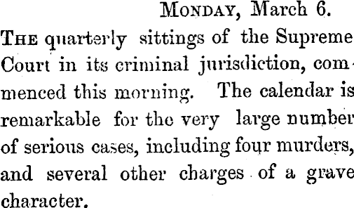 Monday, March 6. The quarterly sittings of the Supreme Court in its criminal jurisdiction, com menced this morning. The calendar is remarkable for the very large number of serious cases, including four murders, and several other charges of a grave character.