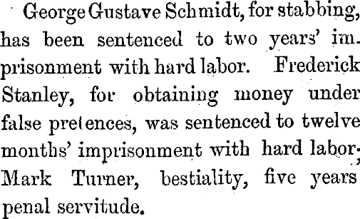 George Gustave Schmidt, for stabbing, has been sentenced to two years' imprisonment with hard labor. Frederick Stanley, for obtaining money under false pretences, was sentenced to twelve months' imprisonment with hard laborMark Turner, bestiality, five years penal servitude.