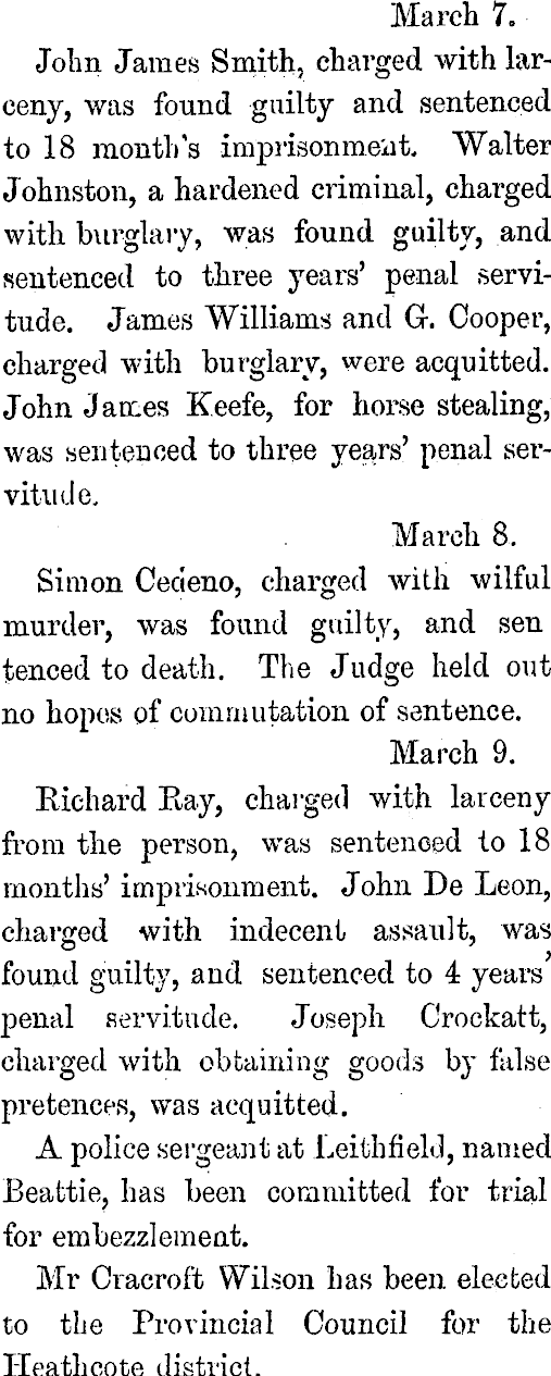 March 7. John James Smith, charged with larceny, was found guilty and sentenced to 18 month's imprisonment Walter Johnston, a hardened criminal, charged with burglary, was found guilty, and sentenced to three years' penal servitude. James Williams and G. Cooper, charged with burglary, were acquitted. John James Keefe, for horse stealing, was sentenced to three years' penal servitude, March 8. Simon Cedeno, charged with wilful murder, was found guilty, and sen tenced to death. The Judge held out no hopes of commutation of sentence. March 9. Richard Ray, charged with larceny from the person, was sentenced to 18 months' imprisonment. John De Leon, charged with indecent assault, was found guilty, and sentenced to 4 years penal servitude. Joseph Crockatt, charged with obtaining goods by false pretences, was acquitted. A police sergeant at Leitbfield, named Beattie, has been committed for trial for embezzlement. Mr Cracroft Wil.son has been elected to the Provincial Council for the Heathcote district.