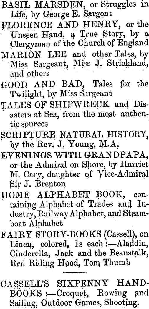 £ASIL or Struggles in Life, by George E. Sargent FLORENCE AND HENRY, or the Unseen Hand, a True Story, by a Clergyman of the Church of England MARION LEE and other Tales, by Miss Sargeant, Miss J. Strickland, and others GOOD AND BAD, Tales for the Twilight, by Miss Sargeant TALES Of SHIPWREpK and Disasters at Sea, from the mqst authentic spurces SCRIPTURE NATURAL HISTORY, })y the Rev. J. Young, M..A. EVENINGS WITH QRAN DPAPA, or the Admiral on SJiore, by Harriet M. Cary, daughter qf Yice-Admiral {3Jr J. Brenton HOME ALPHABET BOOK, containing Alphabet of Trades and Industry, Railway Alphabet, and Steamboat Alphabet FAIRY STORY-BOOKS (Cassell), on Linen, colored, Is each:—Alapldin, Cinderella, Japk and the Beanstalk, Red Riding Hood, Tom Thumb SIXPENNY HANDBOOKS :—Croquet, Rowing and Sailing, Outdoor Games, Shooting.