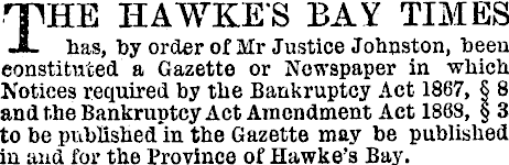 THE HAWKE'S BAY TIMES has, by order of Mr Justice Johnston, been constituted a Gazette or Newspaper in which Notices required by the Bankruptcy Act 1867, § 8 and the Bankruptcy Act Amendment Act 1868, § 3 to be publishedln the Gazette may be published in and for the Province of Hawke's Bay.