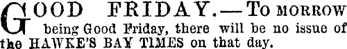 iOOD FRIDAY. —Tomorrow I being Good Friday, there will be no issue of the HAWKE'S BAY TIMES on that day.